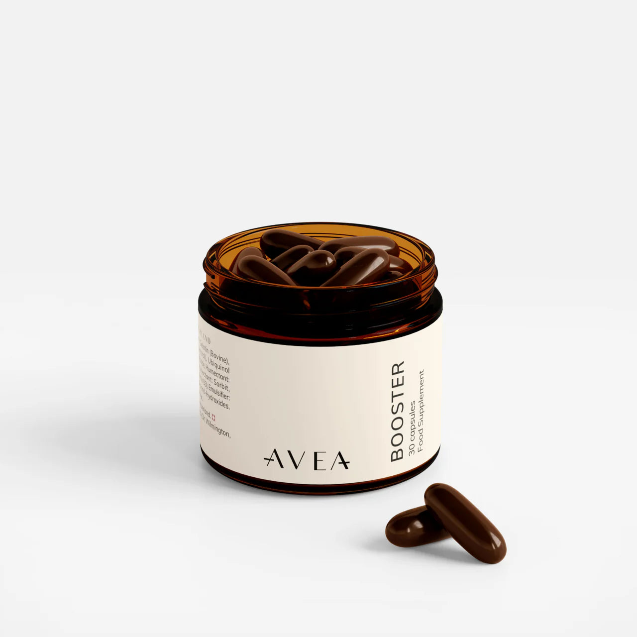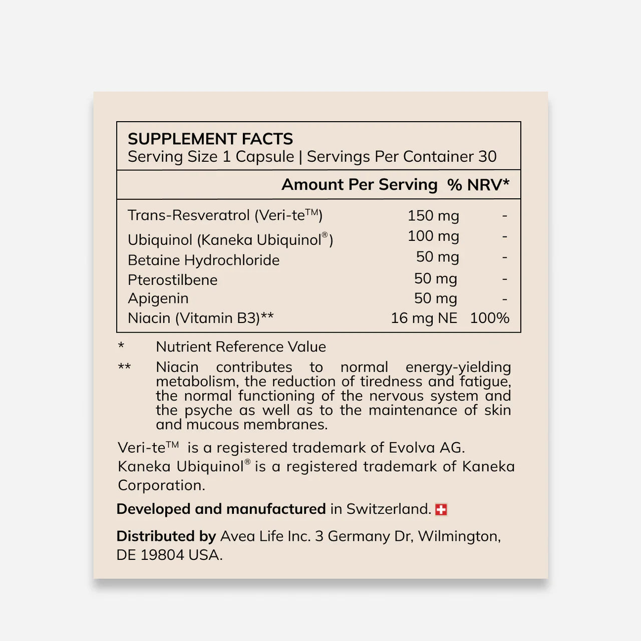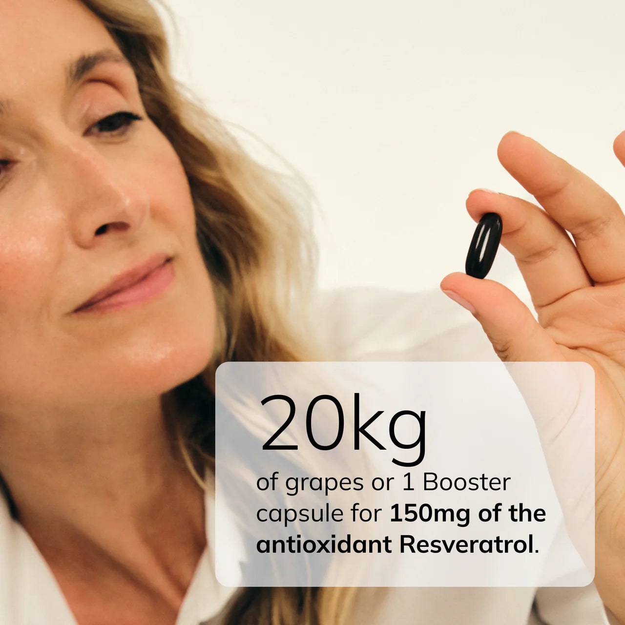 The Booster combines six powerful antioxidants: Ubiquinol CoQ10, Resveratrol, Pterostilbene, Apigenin, Betaine, and Nicotinamide.This combination offers strong protection against free radicals which damage healthy cells and helps your metabolism work more efficiently. When combined with an NAD+ precursor, it further enhances sustained energy levels for long-lasting vitality.