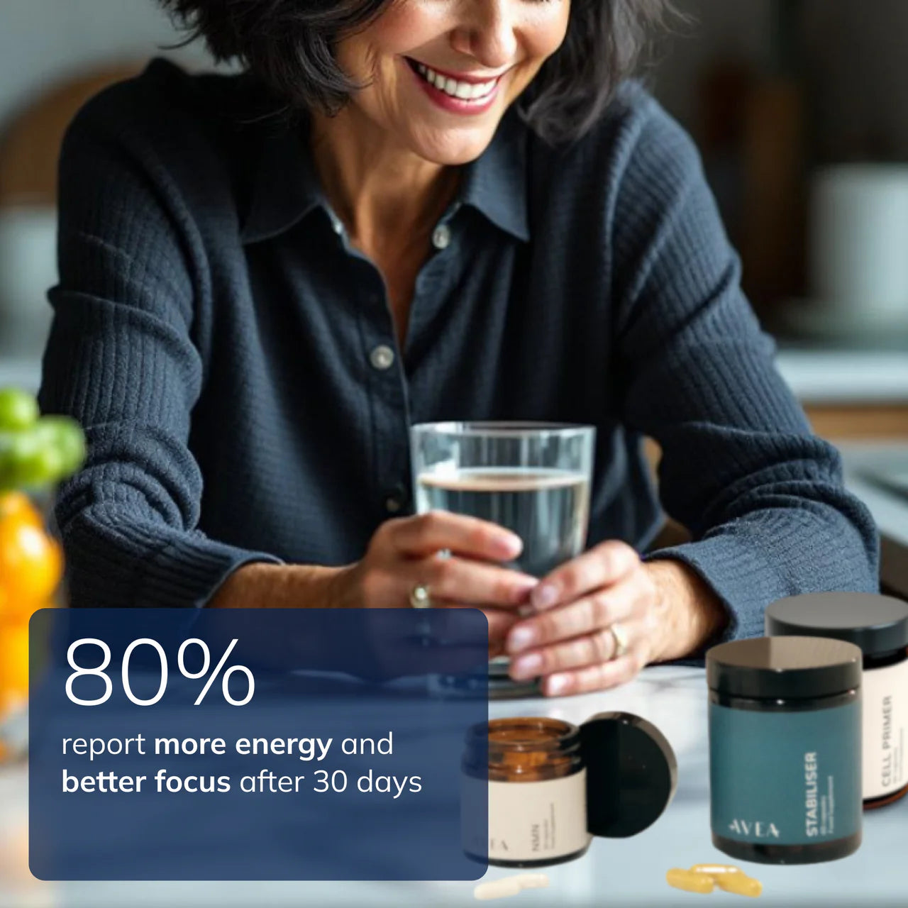 NMN: Enhances energy levels by restoring the levels of NAD+ - the key fuel for our cells - depleted by stress, lack of sleep, and alcohol.
